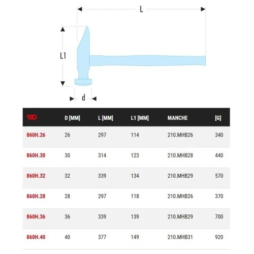 Ce marteau à granir 860H dispose d’une tête ronde pour plus de précisions et de puissance.