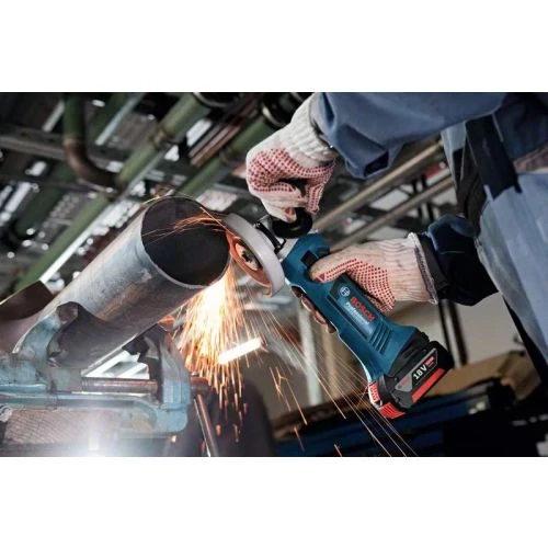 La meuleuse angulaire GWS 18-125 V-LI Professional de la marque Bosch est une petite machine équipée d’un moteur haute performance à 4 pôles légère, elle est d’autant plus puissante qu’une meuleuse filaire de 800 W. Extrêmement légère, la meuleuse est idéale pour travailler en hauteur et dans les espaces difficiles d’accès et est conçue pour les applications de tronçonnage et ébarbage sur le métal, le carrelage et les briques. Entre autre, cette machine est compatible avec le dispositif d’aspiration GDE 125 EA-S Professional ainsi qu’avec les batteries et chargeurs 18 V de Bosch Professional. Enfin, la GWS 18-125 V-LI Professional dispose aussi d’un capot de protection et d’une protection anti-redémarrage.