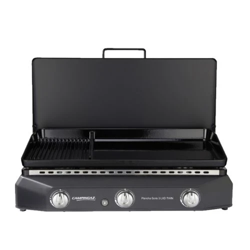Cette plancha SORIO 3 LXD TWIN de la marque CAMPINGAZ est destiné pour raviver les repas entre amis et famille. Elle dispose de deux surfaces bien distinctes : une grille et un plancha. Cela permet de faire cuire différentes nourritures à la fois sans mélanger les gouts. Par ailleurs, elle est équipée de la technologie Blue Flame pour ses 3 brûleurs en acier aluminié permettant une bonne répartition de la chaleur. En outre, elle est inclinée pour guider l’écoulement des graisses. En plus, elle a des pieds ajustables, un couvercle sur charnière, et des poignées de transport.