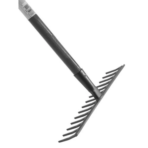 Ce râteau à dents droites sert à mettre à niveau la surface, que ce soit de la terre ou des cailloux. La fixation sur un manche se fait par une douille conique.